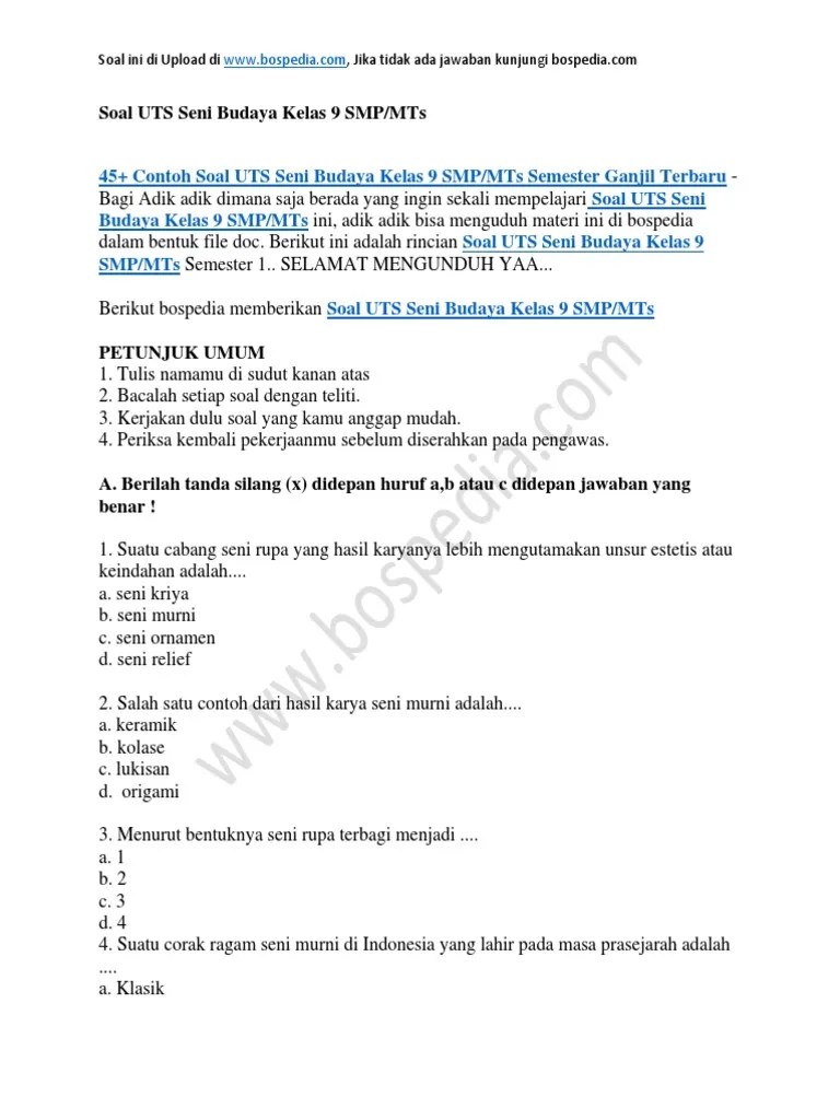 Contoh soal seni budaya kelas 9 semester 1 dan . Latihan soal pts uts semester 2 seni budaya kelas 9 smp k13 ini untuk membantu belajar peserta didik kelas 9 dalam mempersiapkan diri menghadapi pts 2. Jangan lupa cek soal essay seni budaya kelas 9 semester 1 bab 2 lainnya! Seni budaya kelas/ semester : Berikut ini adalah contoh soal penilaian tengah semester (pts/ uts) mata pelajaran seni budaya kelas 9 (ix) semester 1 (ganjil/gasal) smp/ mts kurikulum .
